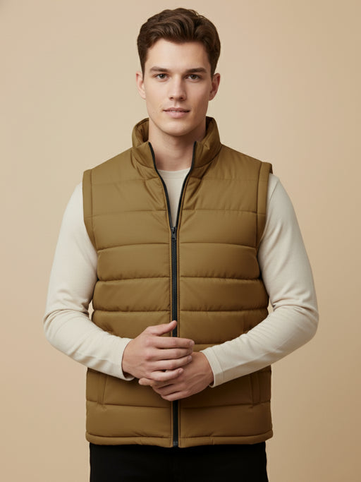 Stylish Puffer Sleeveless Zipper Mockneck Jacket For Men-Light Brown-BRPH24