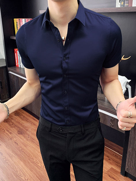 Louis Vicaci Super Stretchy Slim Fit Half Sleeve Summer Formal Casual Shirt For Men-Dark Navy-RT1998