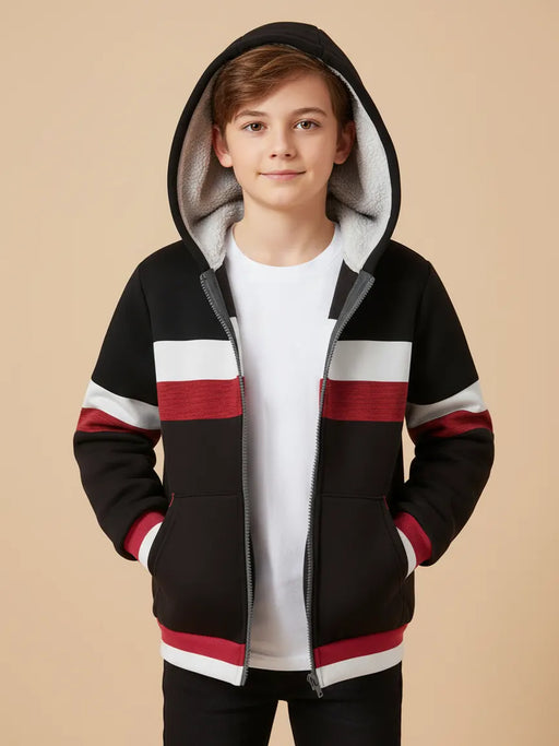NXT Inner Fur Hood Fleece Full Zipper Hoodie For Kids-Black with Grey, White & Red Panels-BR2705/BR14603